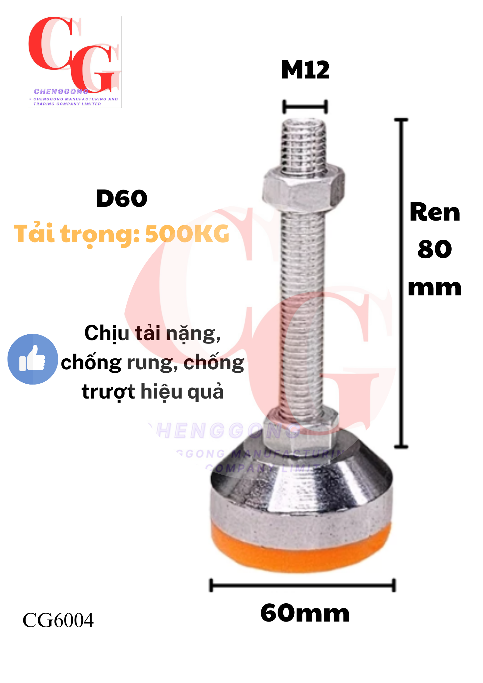 Chân tăng chỉnh chịu lực, bát thép mạ niken, đệm PVC chịu tải màu cam hoặc đen, được thiết kế đặc biệt để chịu tải lớn như máy móc, dây chuyền sản xuất, giá kệ cơ khí và đảm bảo sự ổn định cho thiết bị. Đế nhựa PVC chịu tải tránh sự tiếp xúc trực tiếp của thiết bị với mặt sàn, tránh trơn trượt, ma sát mạnh, duy trì độ bền thiết bị.