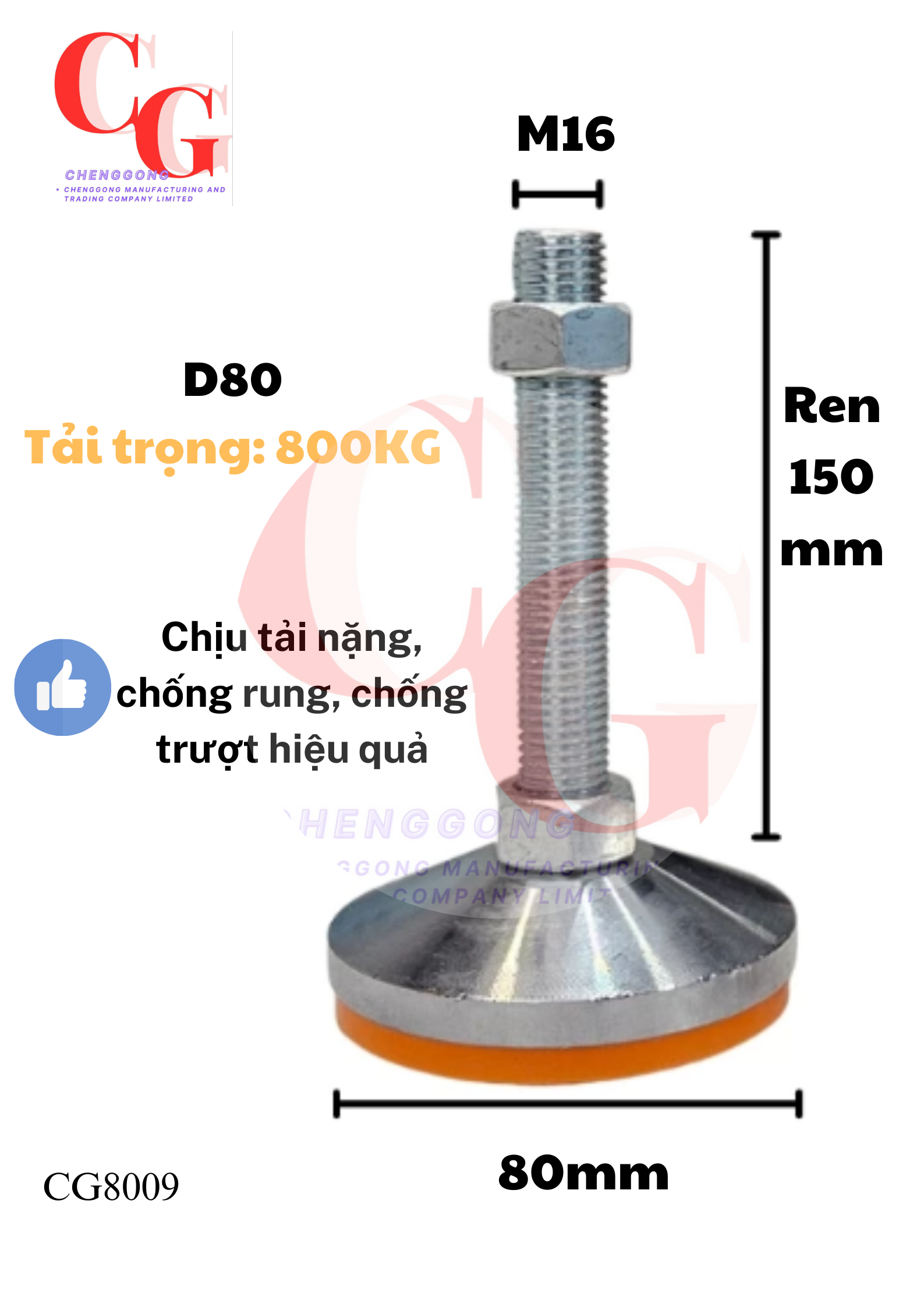 Chân tăng chỉnh chịu lực, bát thép mạ niken, đệm PVC chịu tải màu cam hoặc đen, được thiết kế đặc biệt để chịu tải lớn như máy móc, dây chuyền sản xuất, giá kệ cơ khí và đảm bảo sự ổn định cho thiết bị. Đế nhựa PVC chịu tải tránh sự tiếp xúc trực tiếp của thiết bị với mặt sàn, tránh trơn trượt, ma sát mạnh, duy trì độ bền thiết bị.